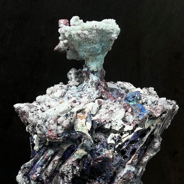 ⾃然現象の模倣である陶芸の技法を使い、⾃然界には存在しない⽯を作っている。鉱物から⽣じた釉薬と⼟で芯を作り、焼成による溶融と重⼒の影響を受けたものをグラインダーで削り出す。