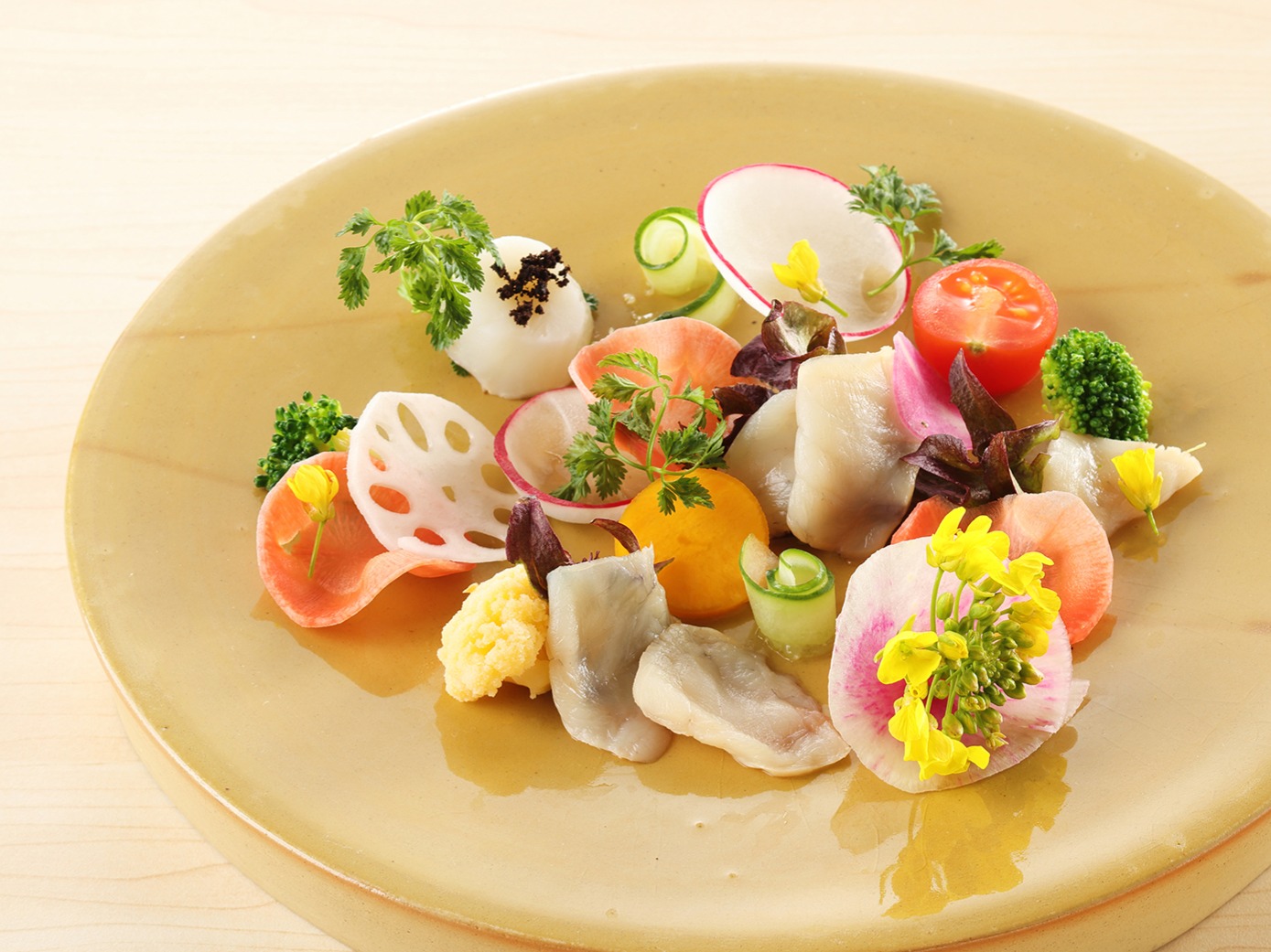 瀬戸内とらフグのスモークカルパッチョ 季節のいろどり旬野菜 シャンパーニュソース